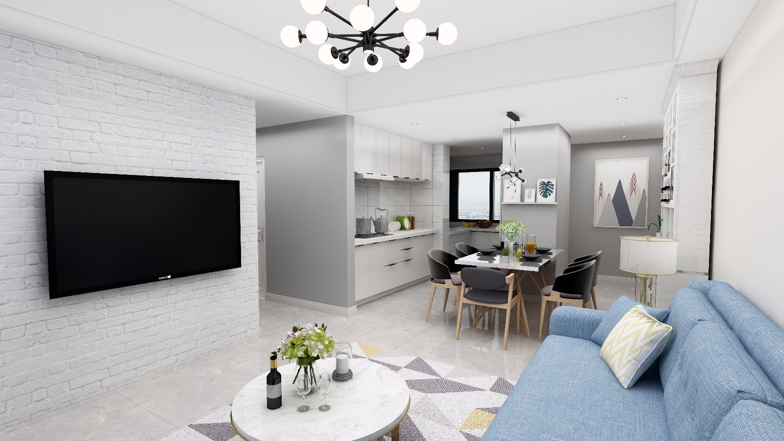 客厅、餐厅、厨房都是开放式设计,整体看过去比较简单素雅,几何形拼贴的地毯十分简约自然,浅蓝色的沙发比较优雅,搭配简单的白色圆形茶几也十分实用好看。