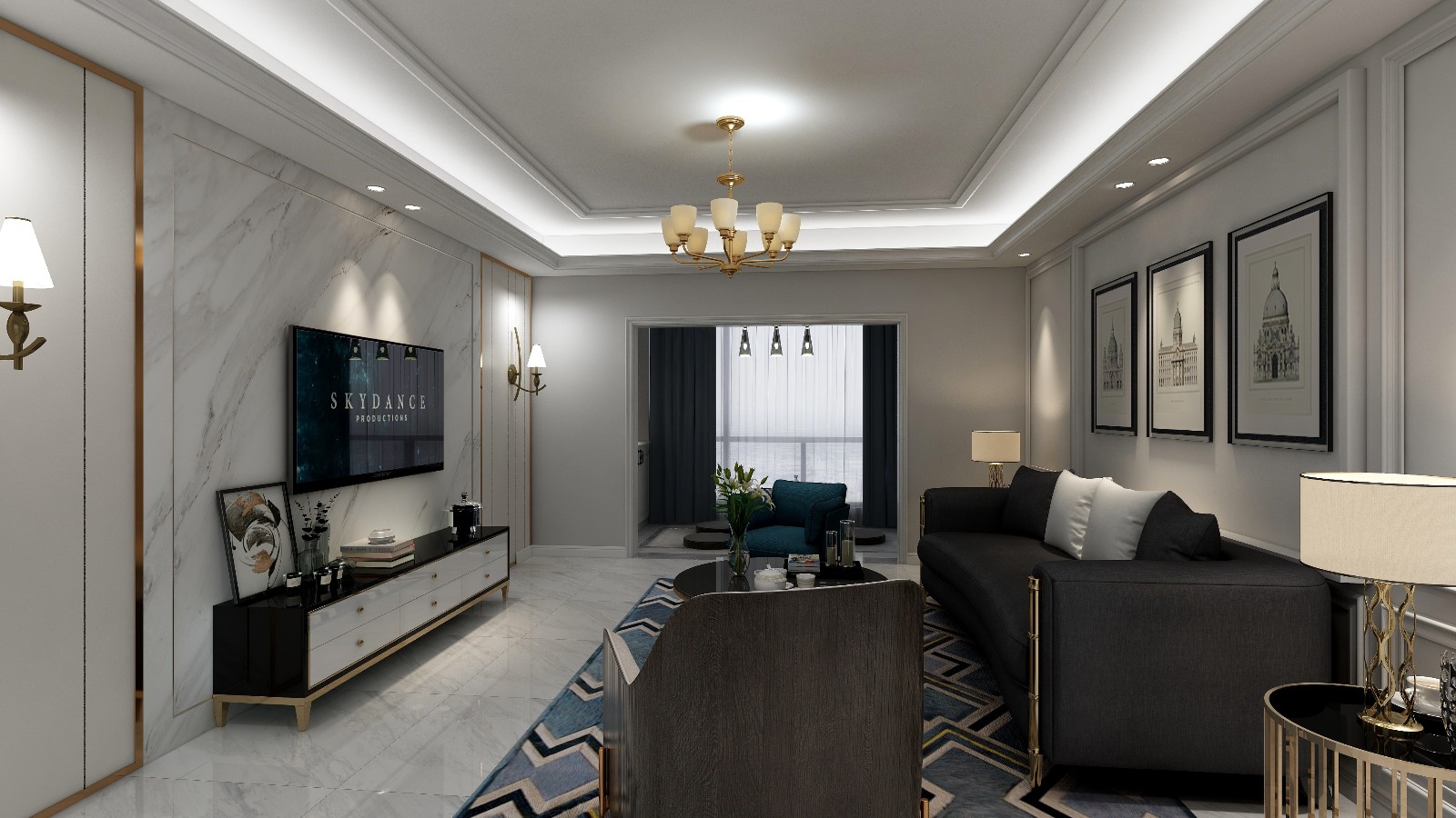 进门就可以看到大厅天花板上的金属制吊灯,和白色射灯,灯带结合,让房间看起来更加大气。斜置的木质沙发椅,让家具陈列看起来更加亲切、随合,也让客厅保有开阔的视野。