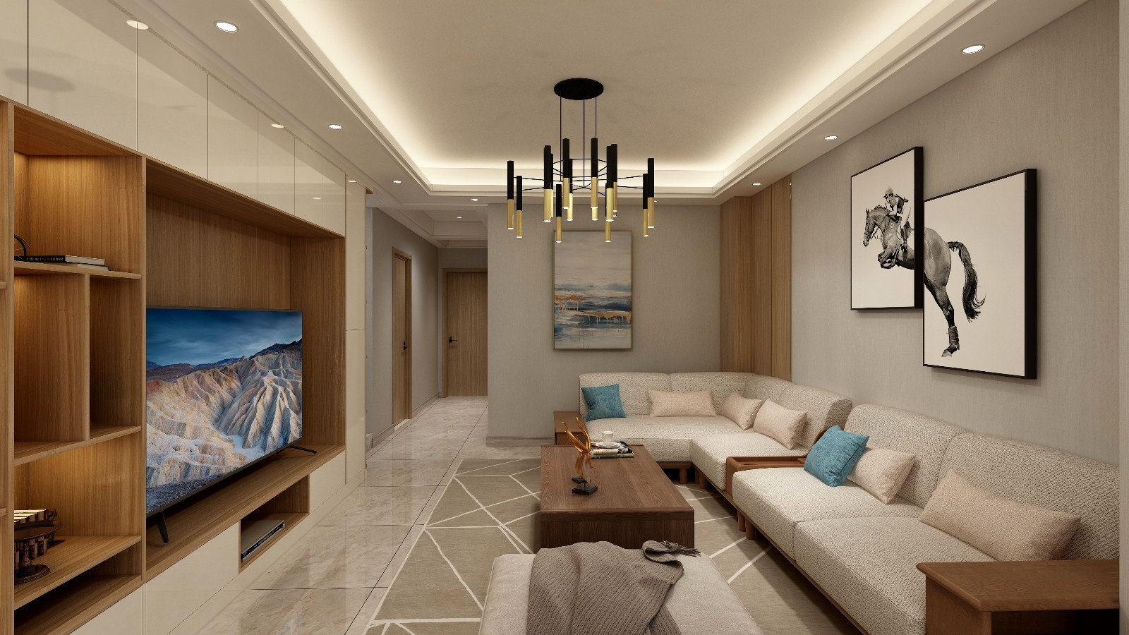 灰色纹理的地砖,在天花板的灯带和射灯的结合下,投射出自然舒适的生活温度。