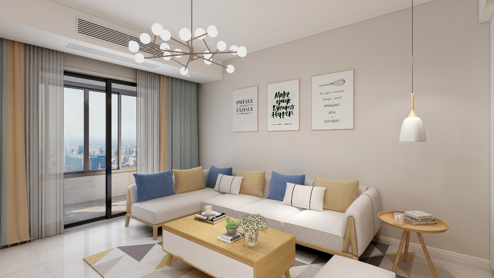 沙发旁的吊灯设计也是创意十足,时尚大方。灰色的窗帘搭配一丝黄色来撞色,和黄色蓝色抱枕相搭配,空间完美融合。