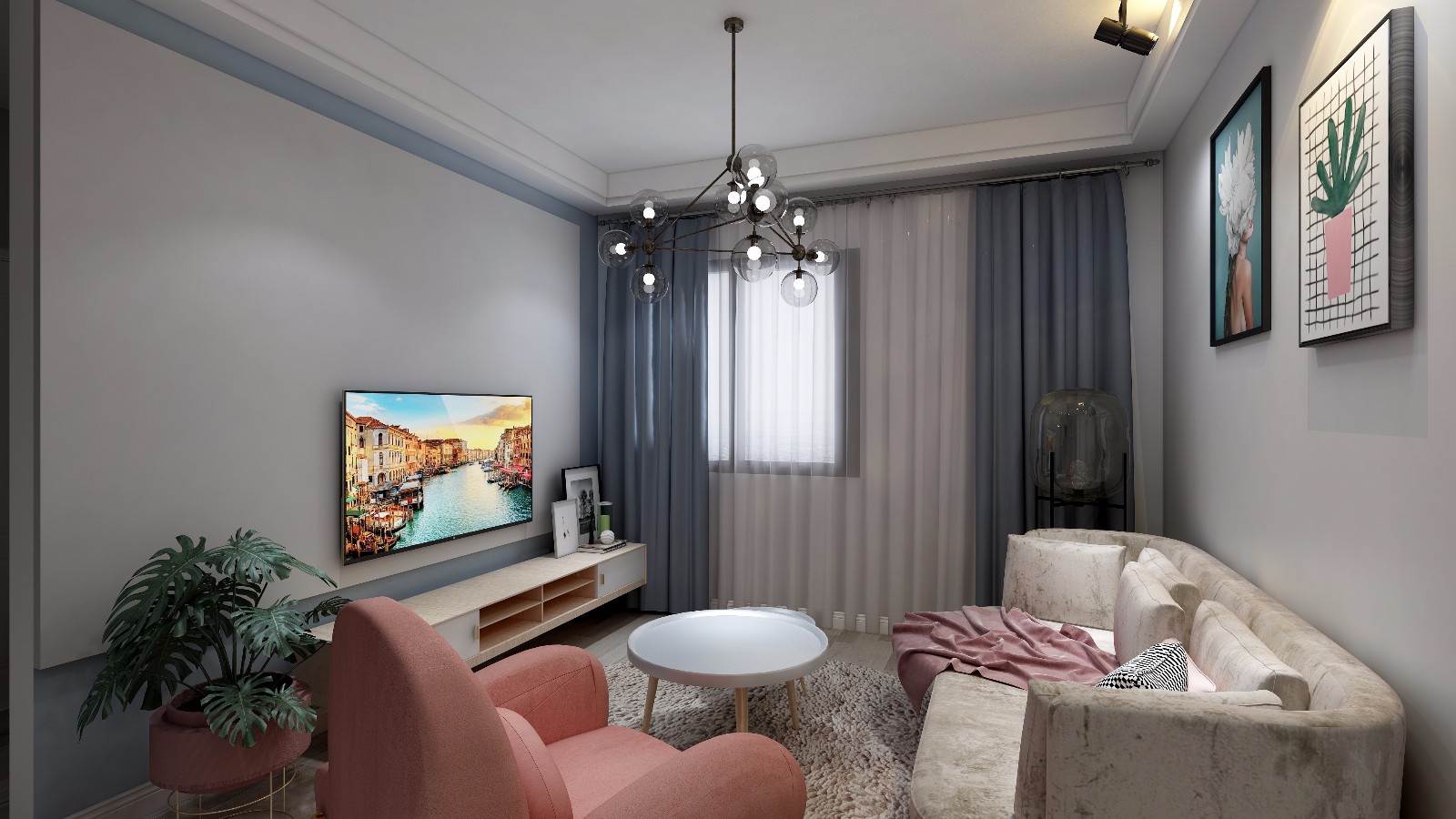 客厅主要用浅灰色与***灰绿,局部粉色搭配,墙上搭配INS风格的装饰挂画,显得清新雅致。