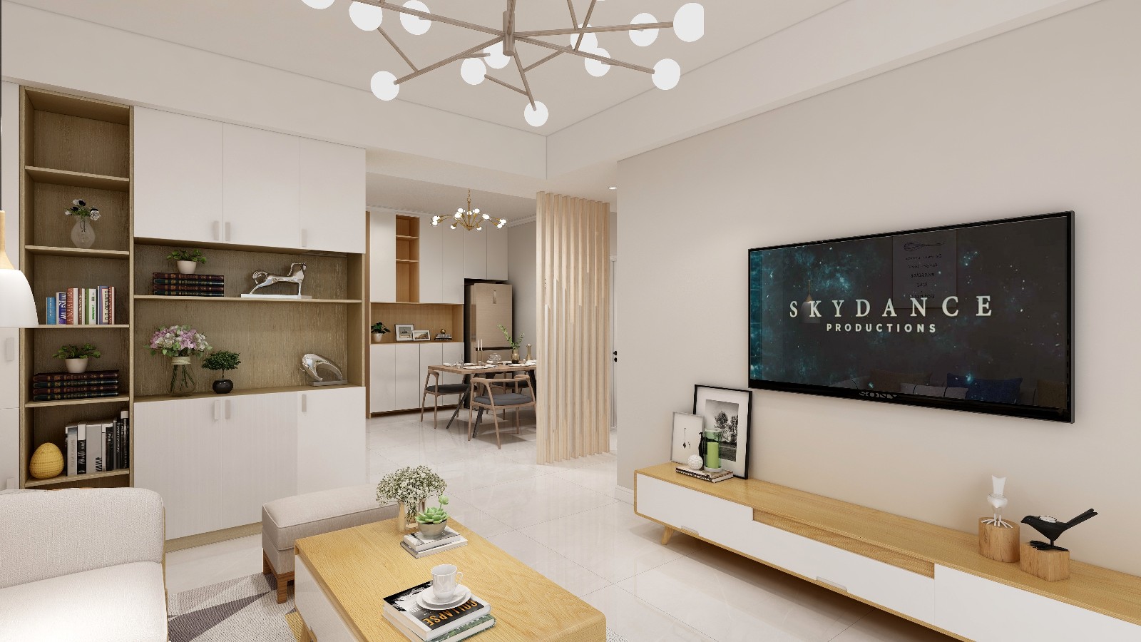留白电视背景墙,原木电视柜搭配装饰摆件即是一景,用木栅栏隔断客厅和餐厅区域,过渡自然。