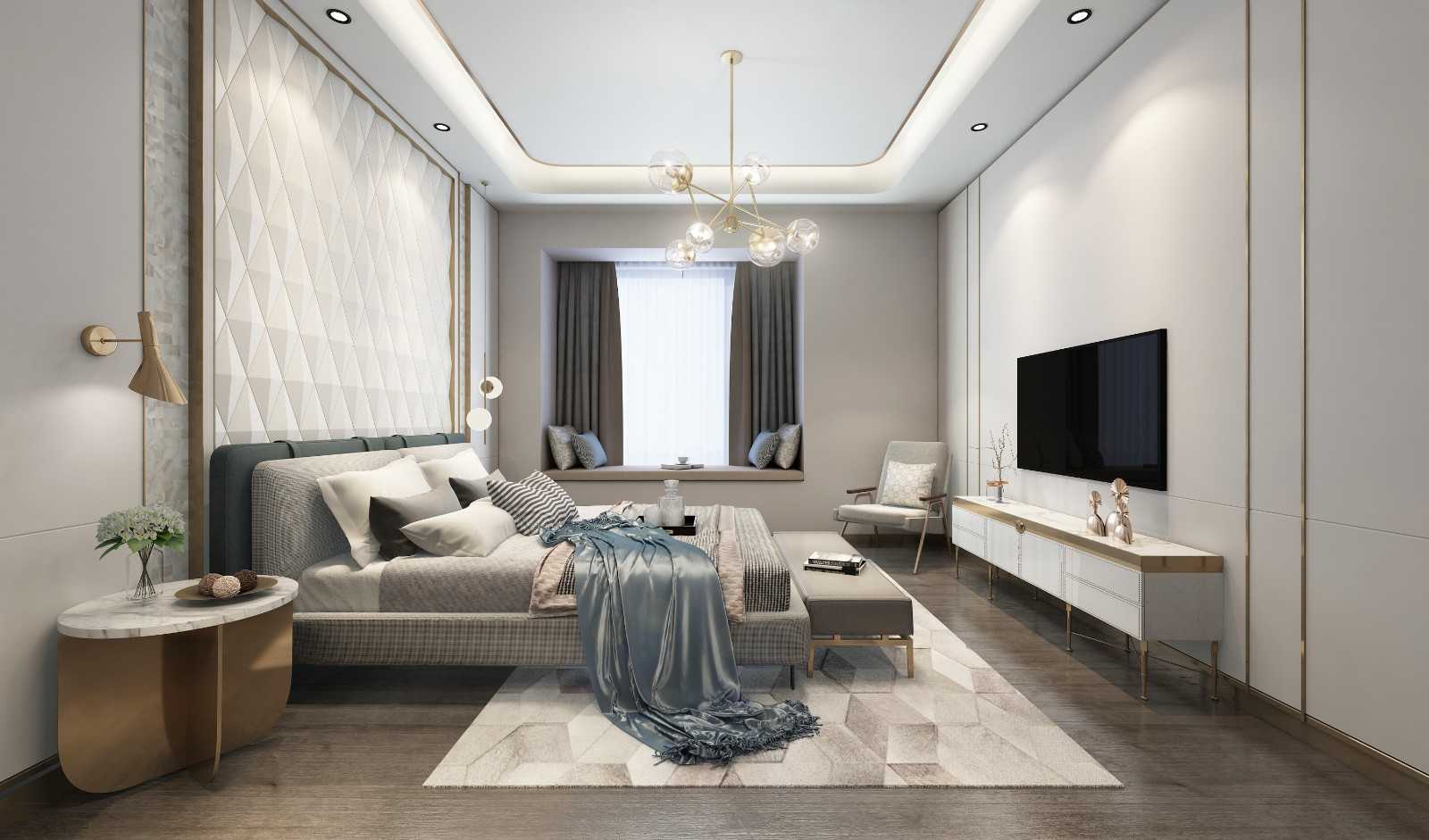 卧室背景墙采用软包,相较于其他背景墙,材料柔软、色彩柔和,能够柔化整体空间氛围,柔软舒适的软包床头是睡前阅读的最佳搭档,舒适度十足,它的立体感还能够提升空间档次。软包除了美化空间的作用外,更重要是的它还具有吸音、隔音、防撞、防震等功能