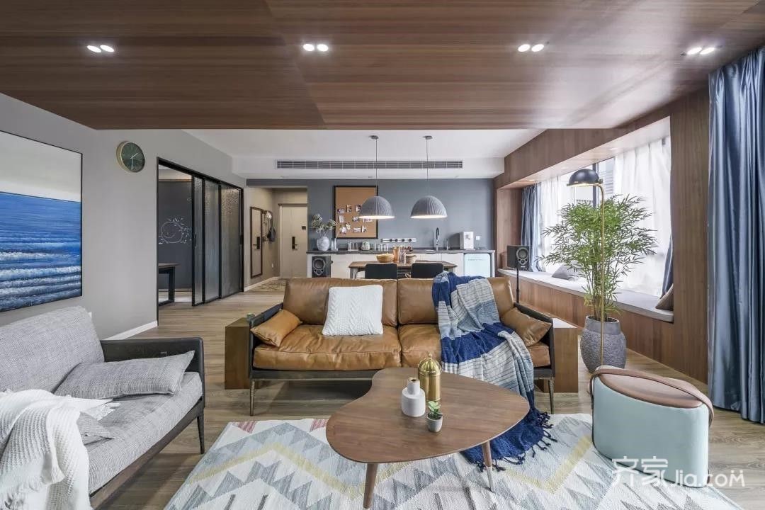 客餐厅横厅的格局,搭配一张驼色皮沙发,不规则的圆茶几,整体天花是木色的客厅,整体给人以端庄现代的舒适感。