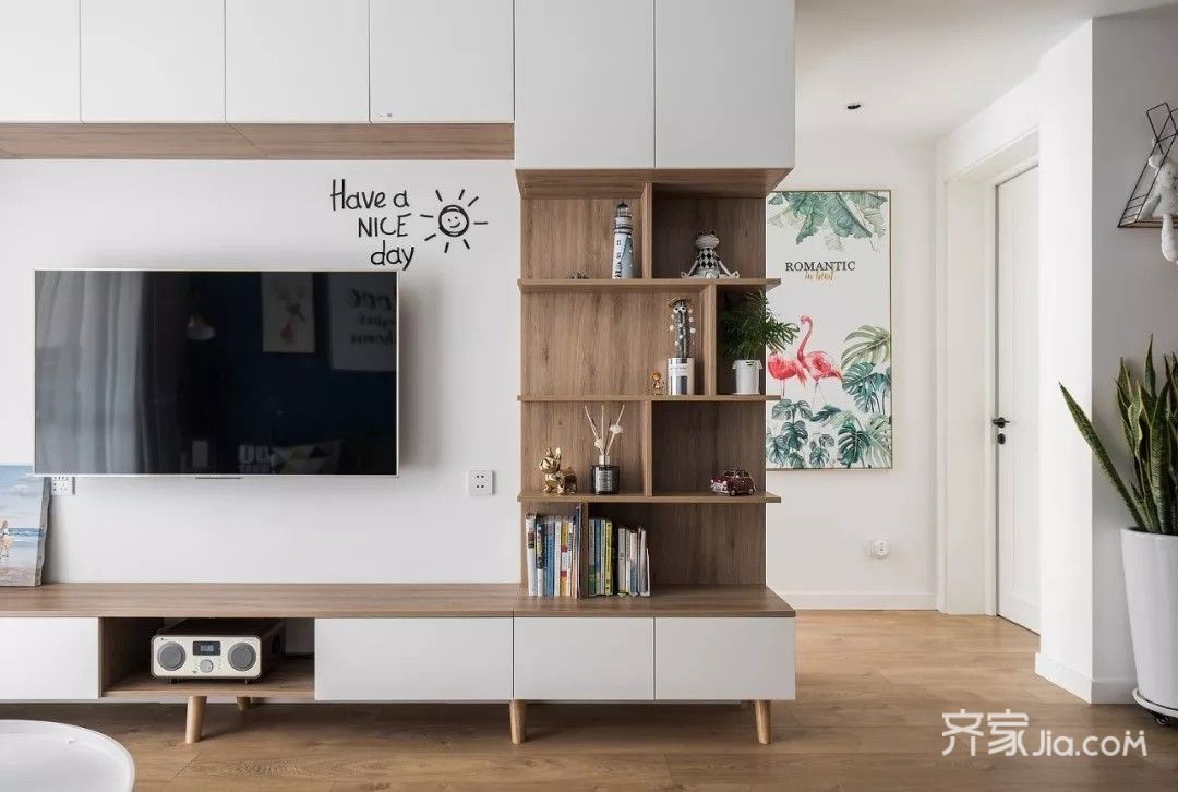 电视墙采用白色打底,原木色调搁架和柜体,提升了客厅空间的储物功能;电视右上角有一句超可爱的贴画:“have a nice day”,每天出门看到这样一句话,整个人都会元气满满的。
