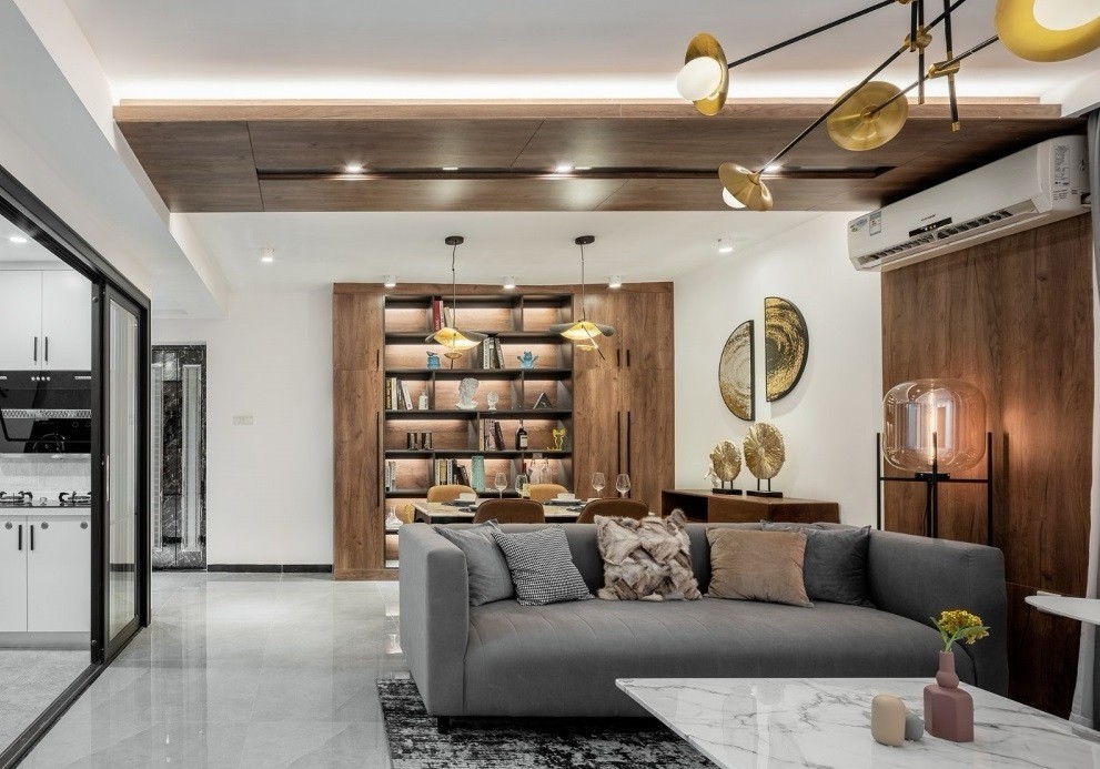 客厅做了半吊顶木质的设计,这样一来客厅与餐厅的功能区域更加清晰,复古轻奢的吊灯,金属质地提升了客厅的格调和气质。