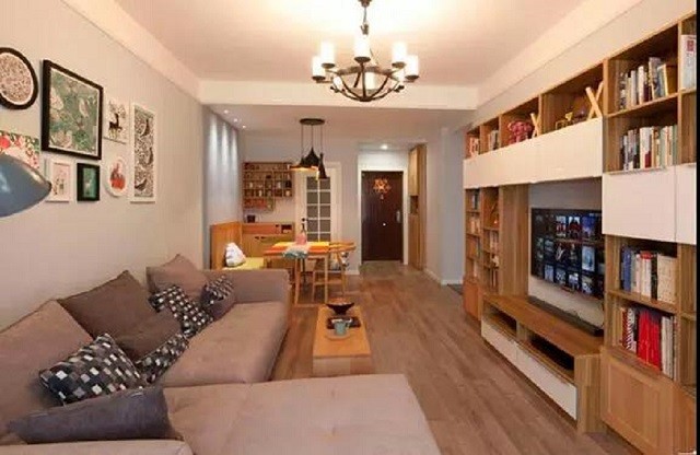电视柜与书柜是一体式的设计,为了节省空间这样设计的。