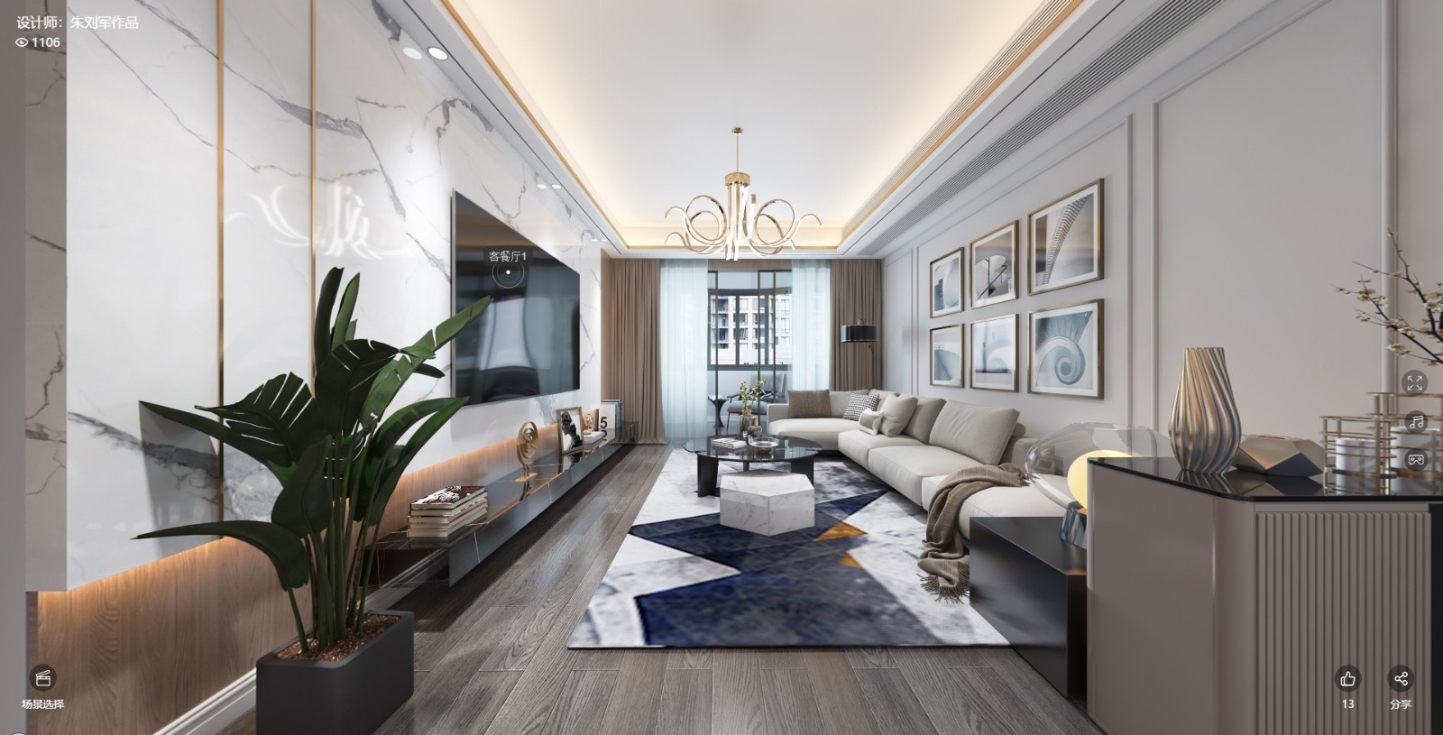 整个案子我们采用的是轻奢风格,当下很受年轻人喜欢,轻奢对于材质的选配要求比较高,简单大气又能显露出一丝奢华。这才是整个风格的关键点,所以在配色上也是跟业主反复推敲才达成了一致。