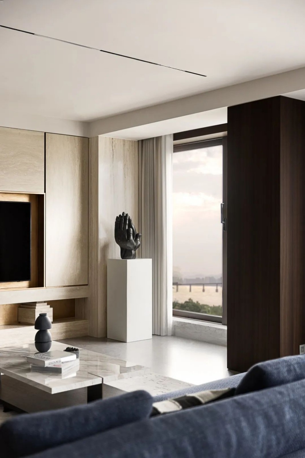 由金属线条切割而出的方形洞石体块以非对称的方式,追求“对称的美学秩序”。引人注目的、逐级内退的造型石墩,于整体立面构成之中,展示着“四两拨千斤”的力量感。满足内嵌的电视机位,外凸的深度同时为暗藏式的柜体收纳,融功能兼形式于一体。