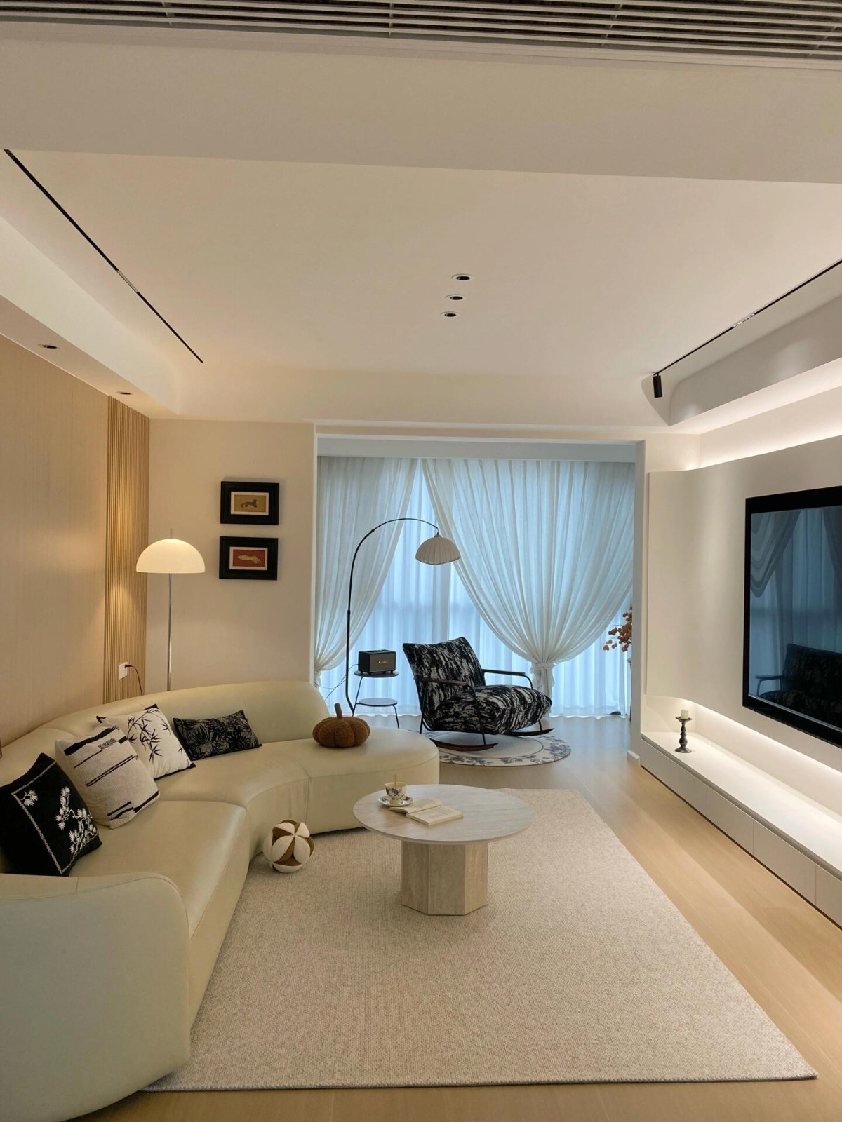 厨房是“开放式”的,有个隐形的推拉门,整体空间会显得更大。餐厅做的是伸缩岛台,增加了收纳的空间~还做了嵌入式电磁炉,嘎嘎好用! 客厅和餐厅的所有柜体都是肤感白,姐妹们记得根据墙漆的颜色来选柜体颜色,这样会避免了五颜六色的白。 主卧衣帽间打通一起的是个小套间,中间是洗漱区,通墒铺人字拼木地板,铺完效果超级赞,后悔没有全屋通铺了!