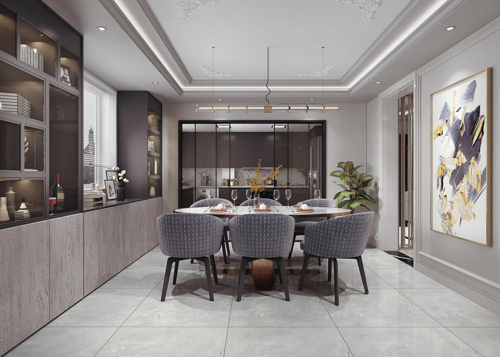 在装饰上面,顶面及地面装饰一概精简:简洁明朗、造型优美的石膏线, 色泽明亮、纹理匀称的瓷砖,奠定了空间整体明亮的色调,电视墙木质的温暖与地面瓷砖的冰冷交相辉映,墙面石膏线造型及金属条造型与顶面及玄关处的金属隔断相呼应,营造轻奢简约、富有生活气息的会客空间。