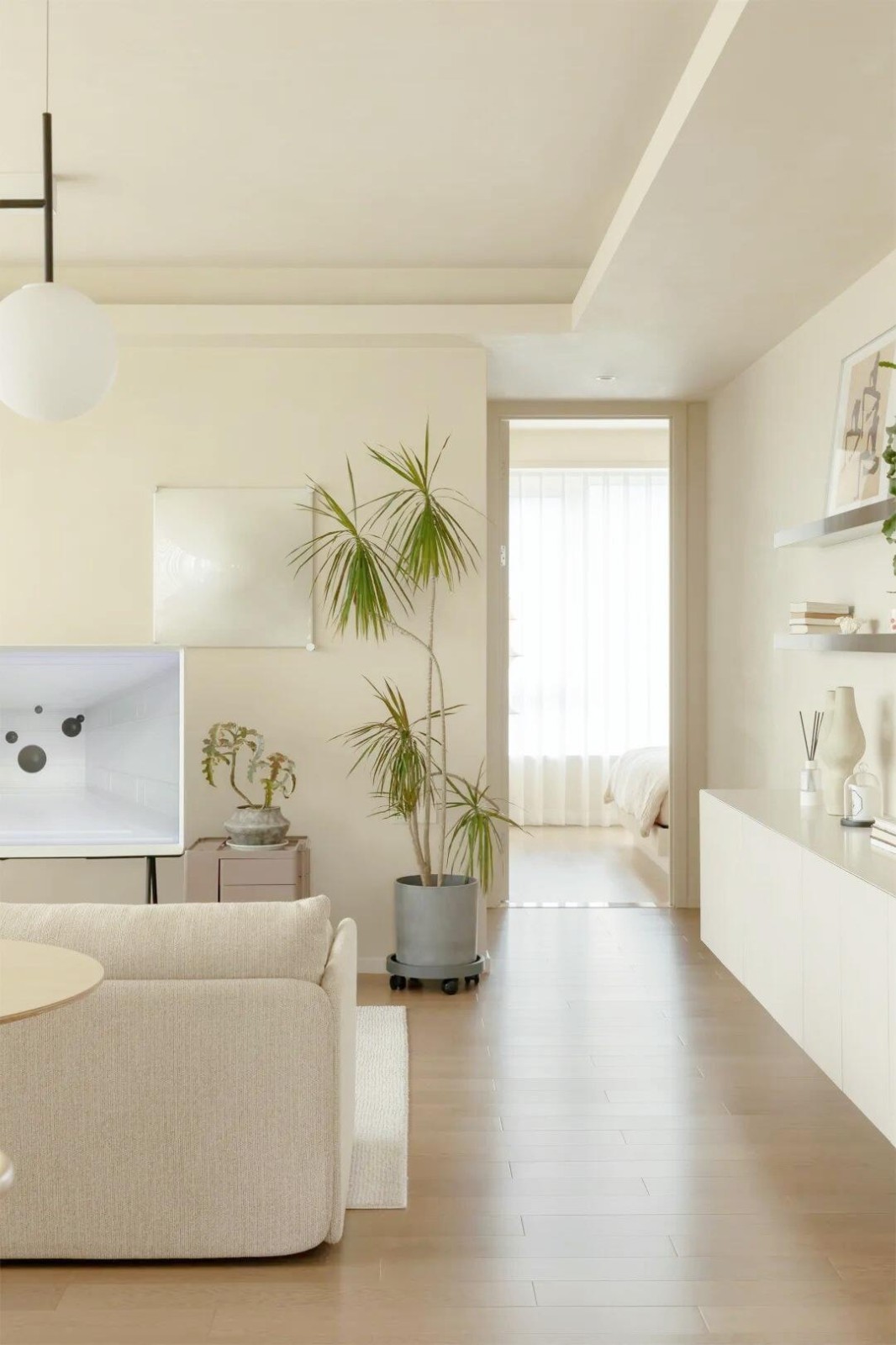 墙面和柜体都用了低饱和度的奶油***觉上温柔又显大,软装也尽量同色系 整体感强,***又治愈~